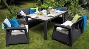 Мебель обычно продается комплектами. В стандартный набор входят кресла, небольшой диван и столик. Изделия выполнены в едином стиле и цветовой гаммы и хорошо смотрятся на открытой веранде или террасе. Мебель является устойчивой и не опрокидывается при порывах ветра. Сидеть на них очень удобно благодаря мягкой ткани, спинка с анатомическими изгибами для расслабления мышц.